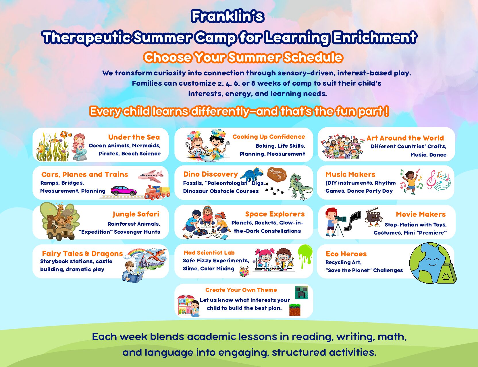 Franklin’s Summer Camp is a sensory-rich, play-based summer program designed to support academic growth, and social-emotional development-without burnout